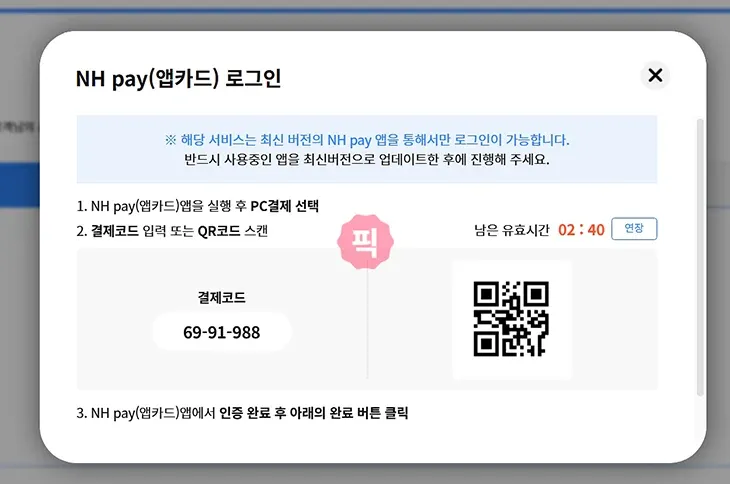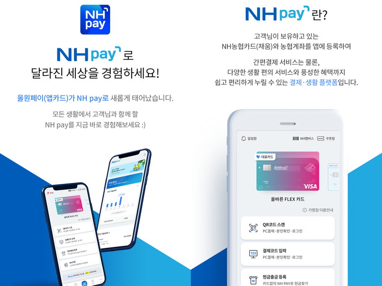 - NH pay 통합 로그인: 스마트폰의 NH pay 앱카드와 조력자처럼 실시간으로 연동하여 복잡한 비밀번호 없이 명확하고 간편한 로그인을 지원합니다.