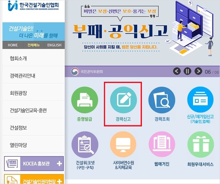 가장 먼저 경력확인서 제출이나 증명서 출력을 위해 한국건설기술인협회 공식 누리집(www.kocea.or.kr)에 접속하시기 바랍니다.