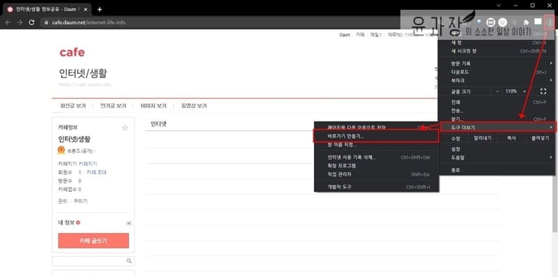 특정 카페 홈페이지 바로가기 아이콘 생성: 브라우저 메뉴의 '바로가기 만들기'를 통해 바탕화면에 전용 아이콘을 조력자처럼 실시간으로 생성 가이드하며 명확한 접근성을 확보합니다.