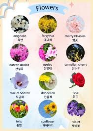 - 장미, 2. 튤립, 3. 백합, 4. 해바라기, 5. 카네이션, 6. 국화, 7. 수국, 8. 안개꽃, 9. 프리지아, 10. 라일락, 11. 거베라, 12. 칼라, 13. 작약, 14. 무궁화, 15. 진달래, 16. 개나리, 17. 벚꽃, 18. 목련, 19. 동백꽃, 20. 매화.