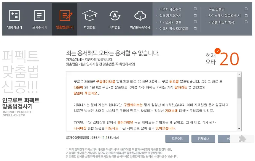 사람인 맞춤형 글자 수 세기·검사 실시간 가이드: 취업 원고의 완성도를 위해 조력자처럼 실시간으로 온라인 가이드하며 명확한 교정 처리를 지원합니다.